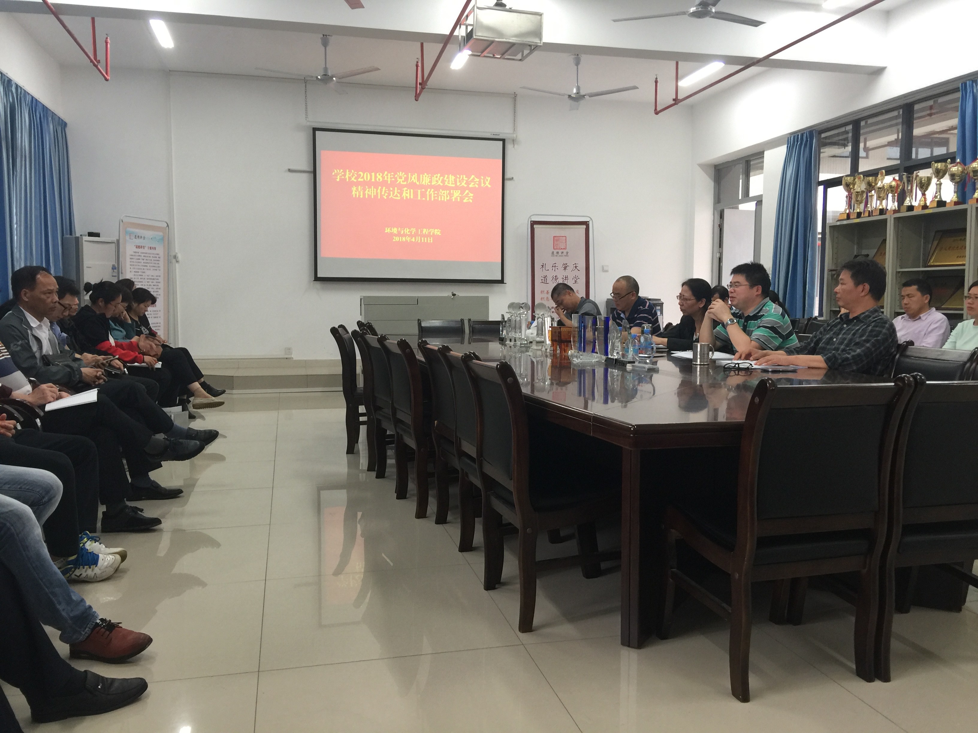 4月11日下午,环境与化学工程学院在理工楼218会议室,召开学校2018年党风廉政建设会议精神传达和工作部署会,学院全体教职工参加会议。会议由党委书记李湘主持。