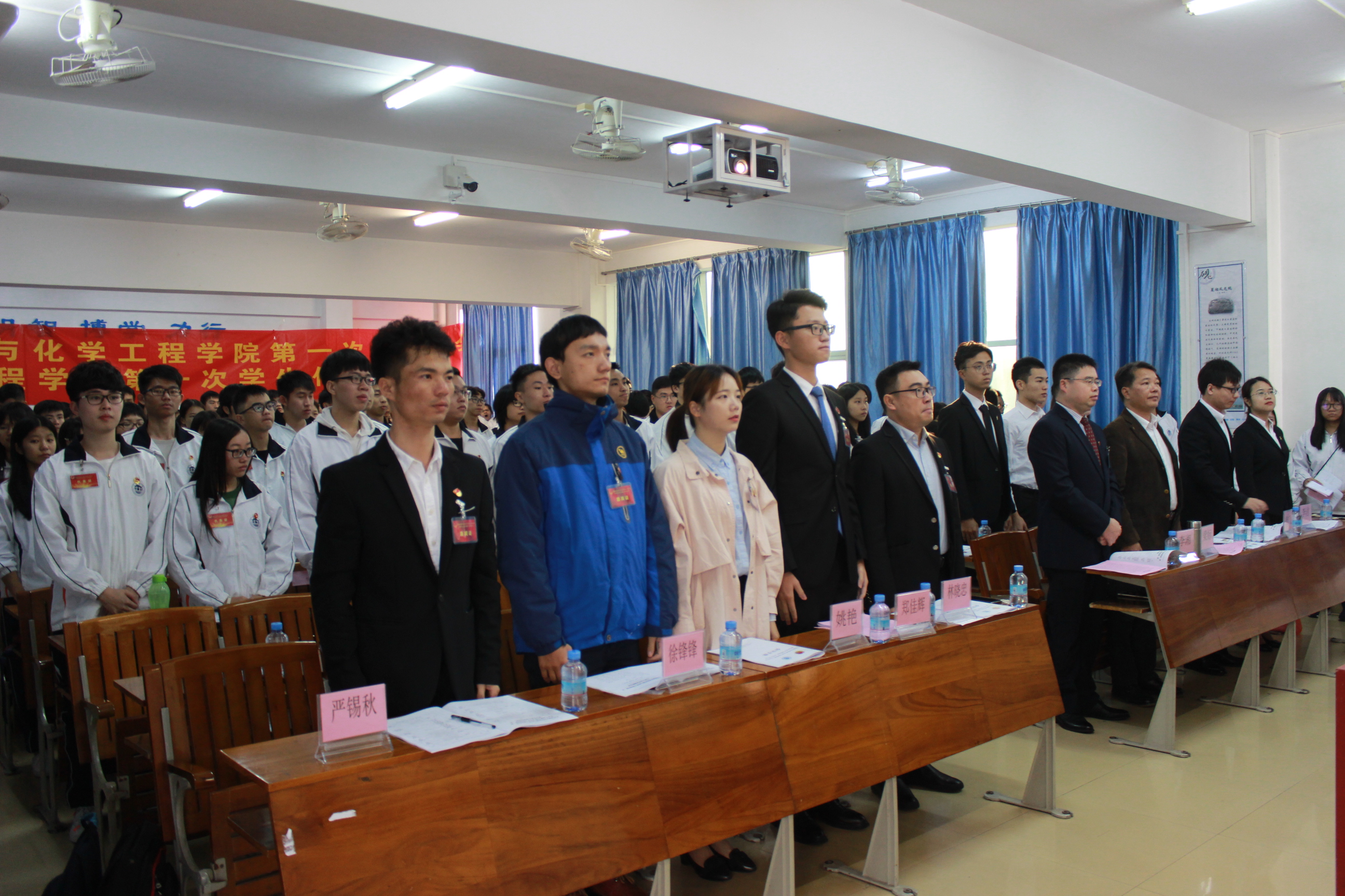 2018年11月25日上午8点,在庄严肃穆的国歌声中,环境与化学工程学院第一次团员代表大会暨第一次学生代表大会在第二教学楼503室拉开序幕。大会由党委委员、上一任团委书记胥家桢担任大会主持。与会领导和嘉宾有校团委常委林晓忠、校学生会执行主席郑佳辉同学、学院党委书记李湘、副书记梁标、学院青年教师代表操江飞、辅导员姚艳、严锡秋、李洁、徐锋锋及学生代表共180人。