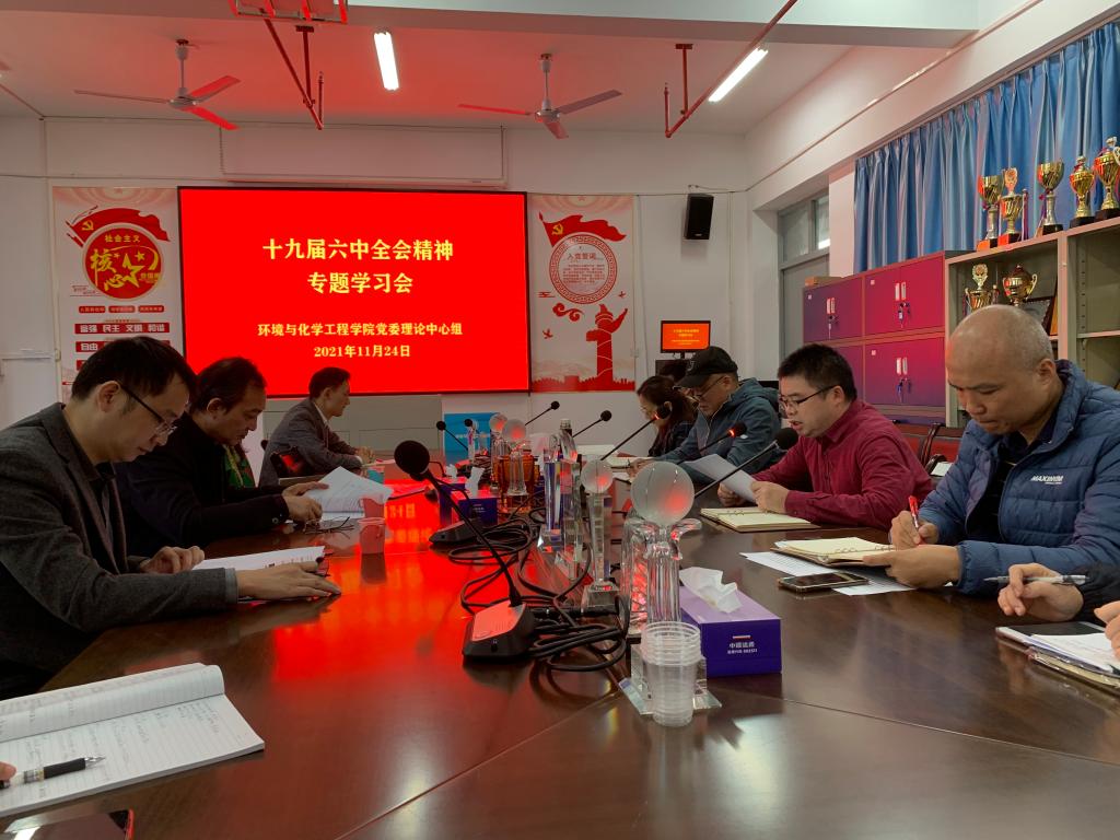 2021年11月24日上午,环境与化学工程学院党委理论学习中心组在学院会议室召开党的十九届六中全会精神专题学习会,学院党委委员、党支部书记参加学习,学院党委书记李湘主持学习会。