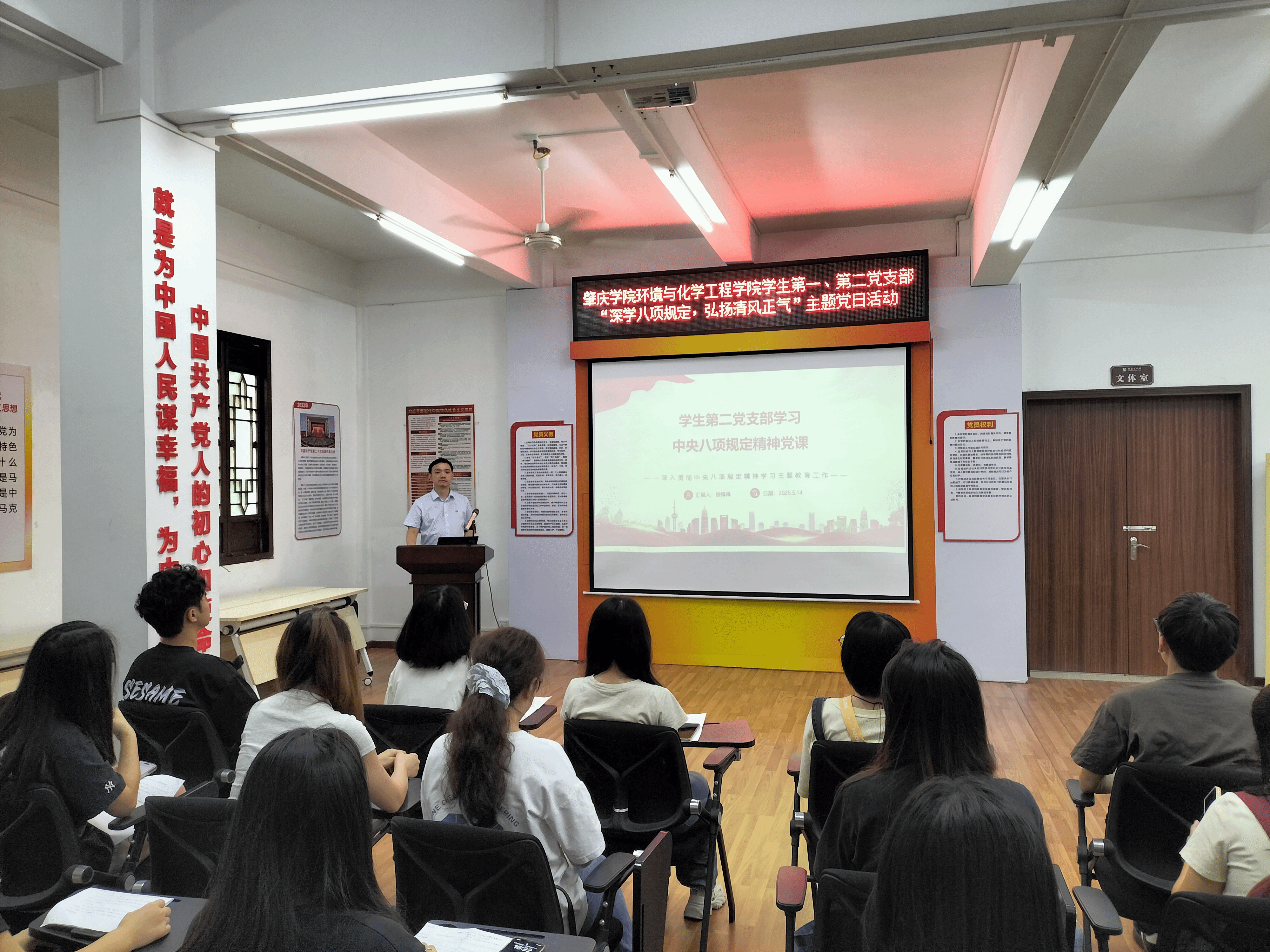 活动中,两位党支部书记在包公学堂分别讲授专题党课。学生第一党支部书记师伟展以“汲取灯盏力量,深学八项规定”为题,结合叶连平的廉洁事迹,深入阐述了八项规定的重要意义和实践要求,号召全体党员筑牢思想防线。