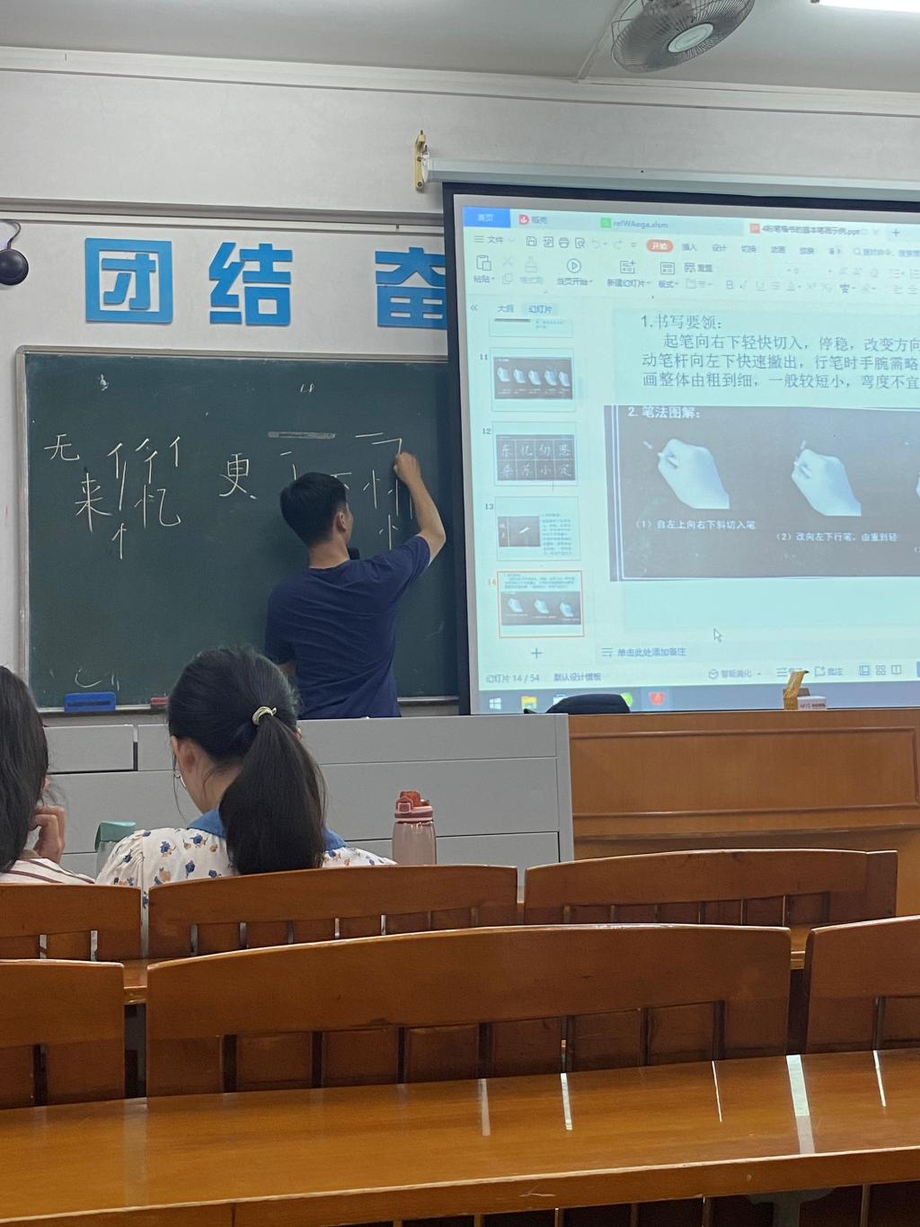 竞赛旨在以赛促练,在全校营造重视教师技能、苦练“两字一画”的氛围,切实提高师范生的基本教学技能。我院领导高度重视,副院长吴燕妮教授拟定方案,由严锡秋老师对师范生进行训练及指导,最后选派粉笔字组、钢笔字组和简笔画组参赛学生各13人次参加学校师范生“两字一画”大赛。