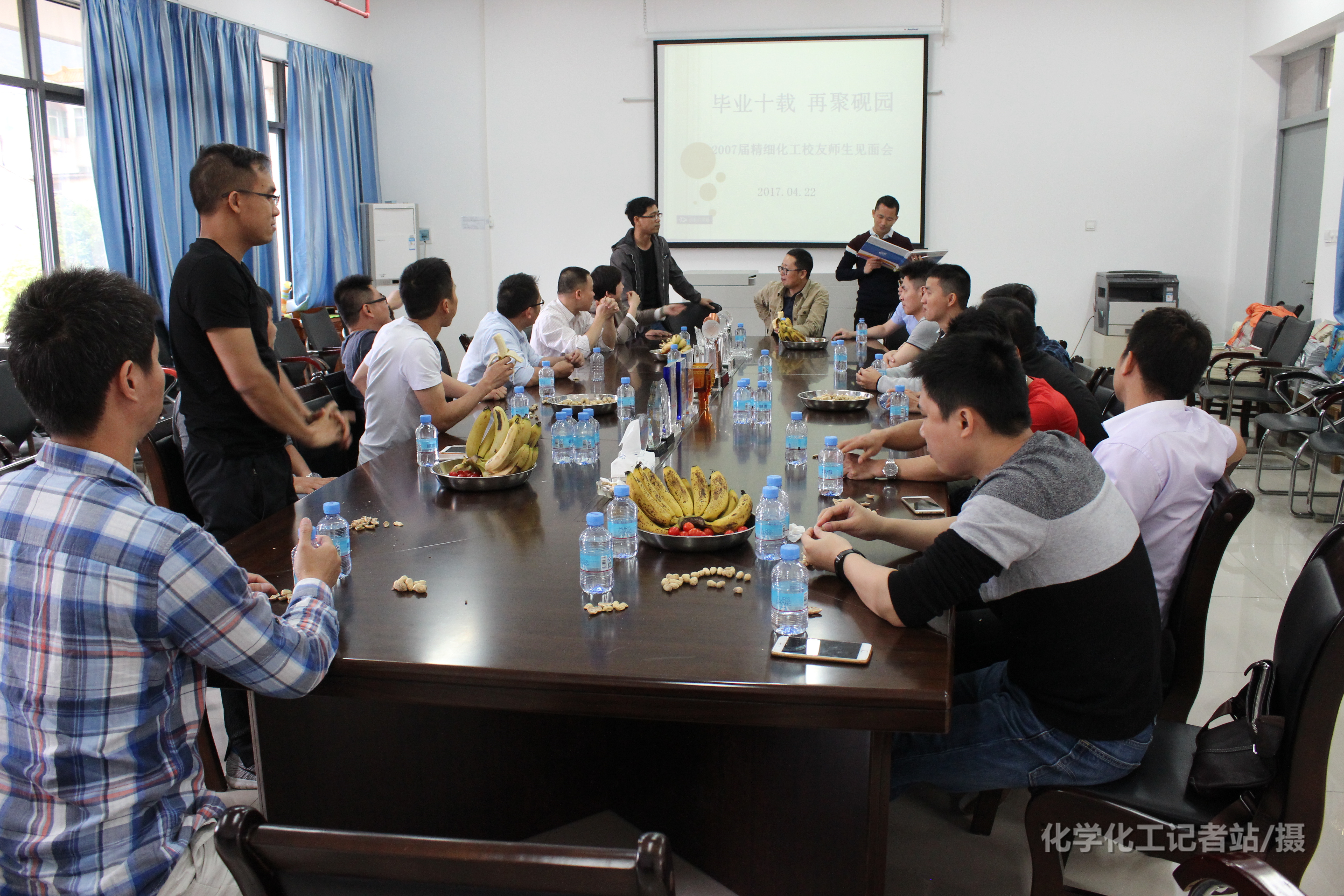 化工学子毕业十载再聚首,昔日的师长、好友再相逢是千言万语都难以言尽的喜悦。主持人杨子岐让每位校友介绍自己并谈谈自己的现状,为了让本次聚会增添色彩还特意找到一本相册里面见证了校友们充实的大学时光。师生们一起回忆当初的校园生活,校友们畅谈自己毕业后的经历。