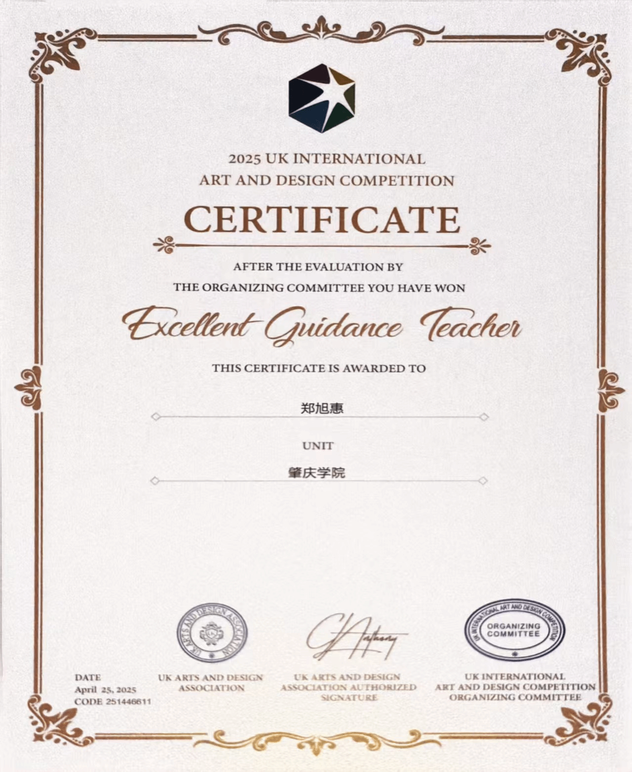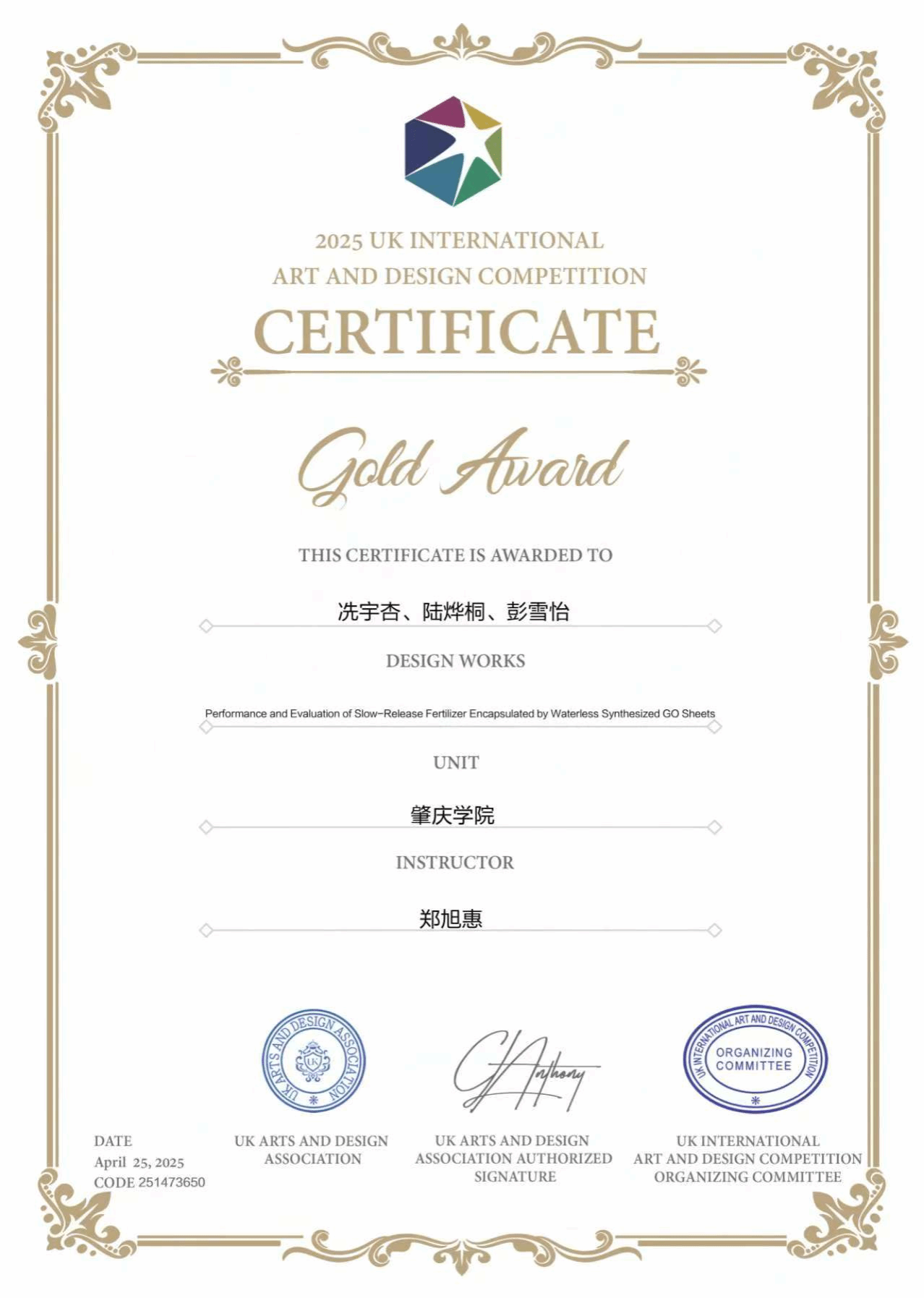 近日,由英国艺术设计协会(UK-AADA)主办的2025英国国际艺术设计大赛全球评审结果正式揭晓。william威廉中文官网环境与化学工程学院郑旭惠老师指导的参赛作品,赢得国际评审委员会高度赞誉,最终斩获:金奖、铜奖、优秀奖各1项,郑旭惠获评优秀指导教师。