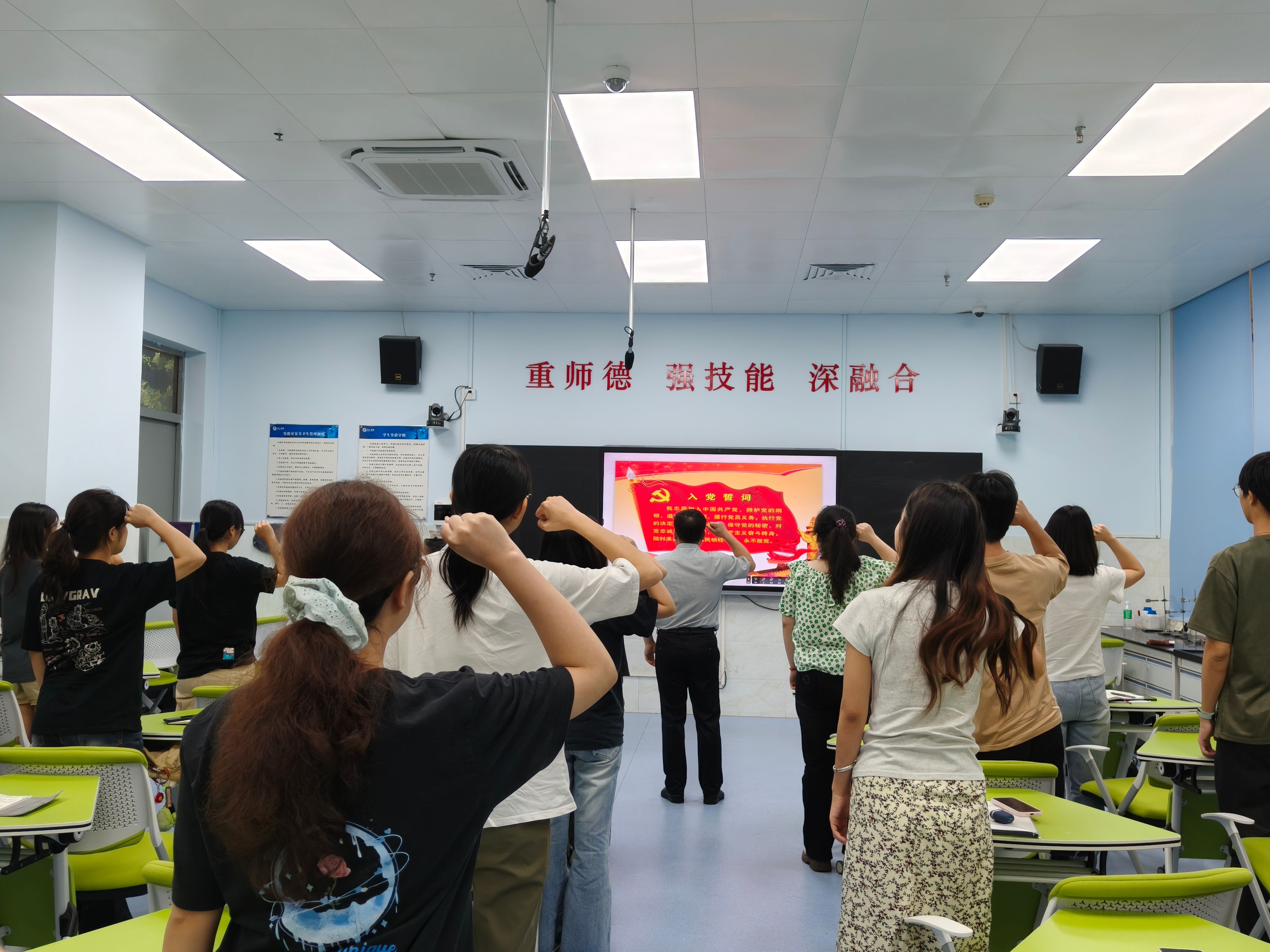 针对授课内容,刘远君与学生党员开展积极互动,党员们踊跃回答。党课最后,刘远君带领全体党员重温入党誓词,进一步坚定了学生党员们的理想信念。