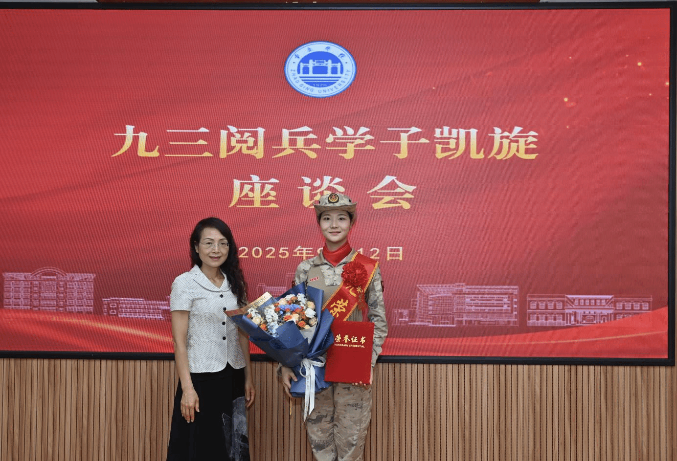 学校领导向王可心表达了欢迎与敬意,赞扬其在九三阅兵训练和仪式的优异表现。李琴为王可心颁发“优秀毕业生”荣誉证书并佩戴“光荣受阅”绶带。