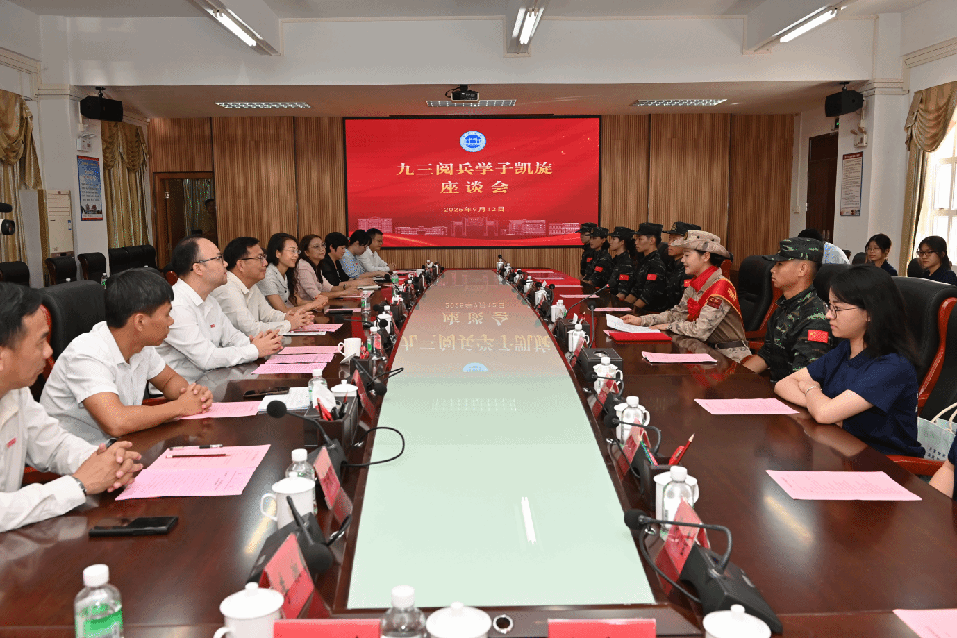 9月12日,学校召开九三阅兵学子座谈会,欢迎2025届化妆品技术与工程专业优秀参阅学子王可心荣誉归来。校党委书记谢冠华,校长李琴,学校相关职能部门负责人,环境与化学工程学院党委书记刘远君、院长李湘等班子成员、辅导员及新生军训教官和青马工程学员代表参会。