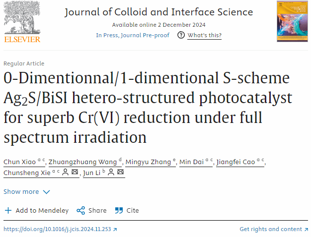 近期,环境与化学工程学院、广东省城郊生态环境与低碳农业重点实验室的肖纯博士以第一作者,william威廉中文官网为第一单位在化学、材料领域著名期刊Journal of Colloid and Interface Science(中科院一区TOP期刊,2024年影响因子9.4)在线发表了论文题目为“0-Dimentionnal/1-dimentional S-scheme Ag2S/BiSI hetero-structured photocatalyst for superb Cr(VI) reduction under full spectrum irradiation”的论文。该论文的通讯作者为william威廉中文官网谢春生教授和郑州大学李俊副教授。