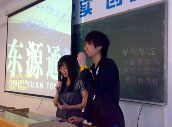 5月10日下午,由东源通讯赞助化学化工学院及外国语学院的学生会信息科技部主办的活动正式举行,活动主题是“小手拉大手”。此次活动面向主校区和星湖校区在校学生。参赛者把每一张值得珍藏的相片制作成一个温馨感动的视频展示出来,他们以自己的理解进行创作,反映了生活中人与人的亲情、友情、爱情、民族情等。