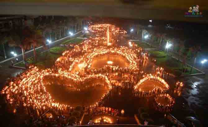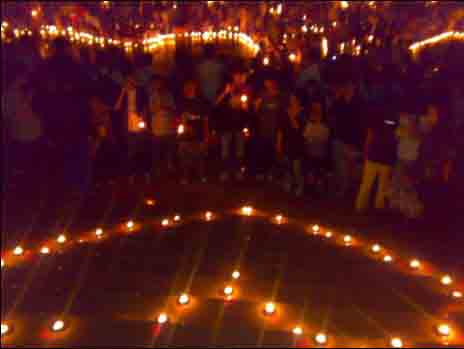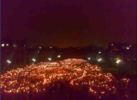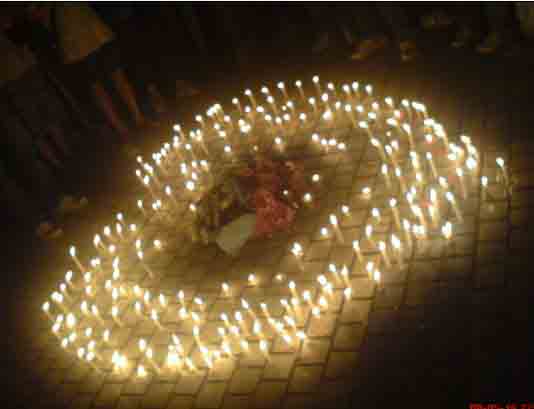 下图为我校师生于2008年5月19号21:30分到22:00分在体育馆前自发的悼念活动。