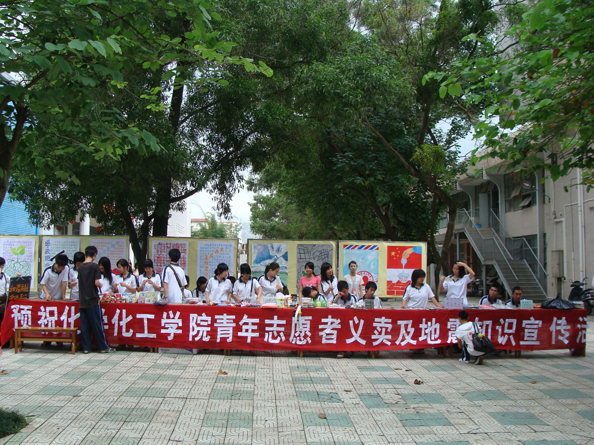 “5·12汶川大地震”牵动了全国人民的心,目前举国上下正全心全力地投入到抗震救灾活动当中。当然,我们化学化工学院的师生也不例外,在之前的爱心捐款中,大家都关心之切,倾囊相助。为了进一步表达我们对四川地震灾区人民的关心和支持,我院青年志愿者于6月11日在学校紫荆校道上举办了一场义卖活动,活动中的所有收益将全部捐献给四川地震灾区。与此同时,为增强广大学生防震意识以及提高发生地震时的逃生能力,志愿者们也对相关知识进行了宣传普及。