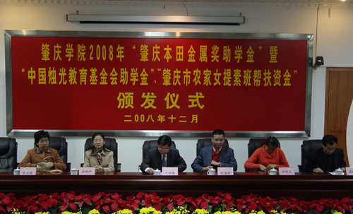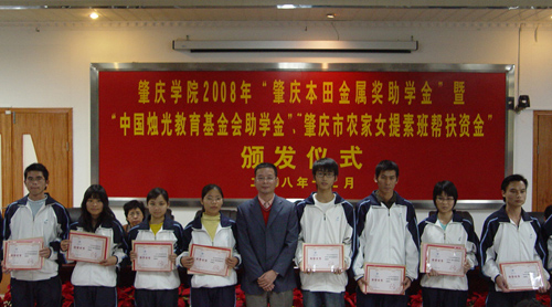 本网讯(记者 张丹华)12月10日下午,我校2008年“肇庆本田金属奖助学金”暨“中国烛光育基金会助学金”“肇庆农家女提素班帮扶资金”颁发仪式在我校行政楼第二会议室隆重举行。校党委副书记叶峥嵘,肇庆市妇联副主席吴文娟等领导出席。此次奖助学金的发放仪式,我院共有四人获奖助学金。