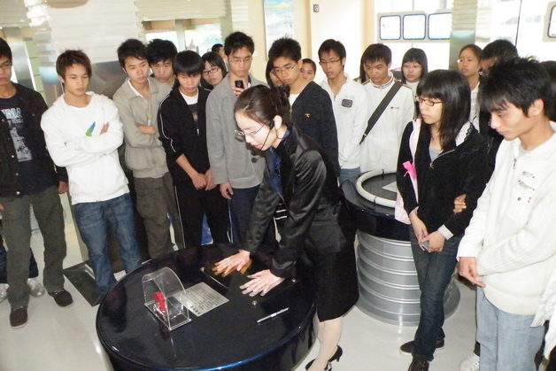 “您的双手也能发电!”图中讲解员正用”手原电池“为首次到访的同学们作示范。(手原电池的原理是以手掌上的汗液为电解质,在双手按压铜板锌板的同时形成一个原电池,能产生微小的电压)
