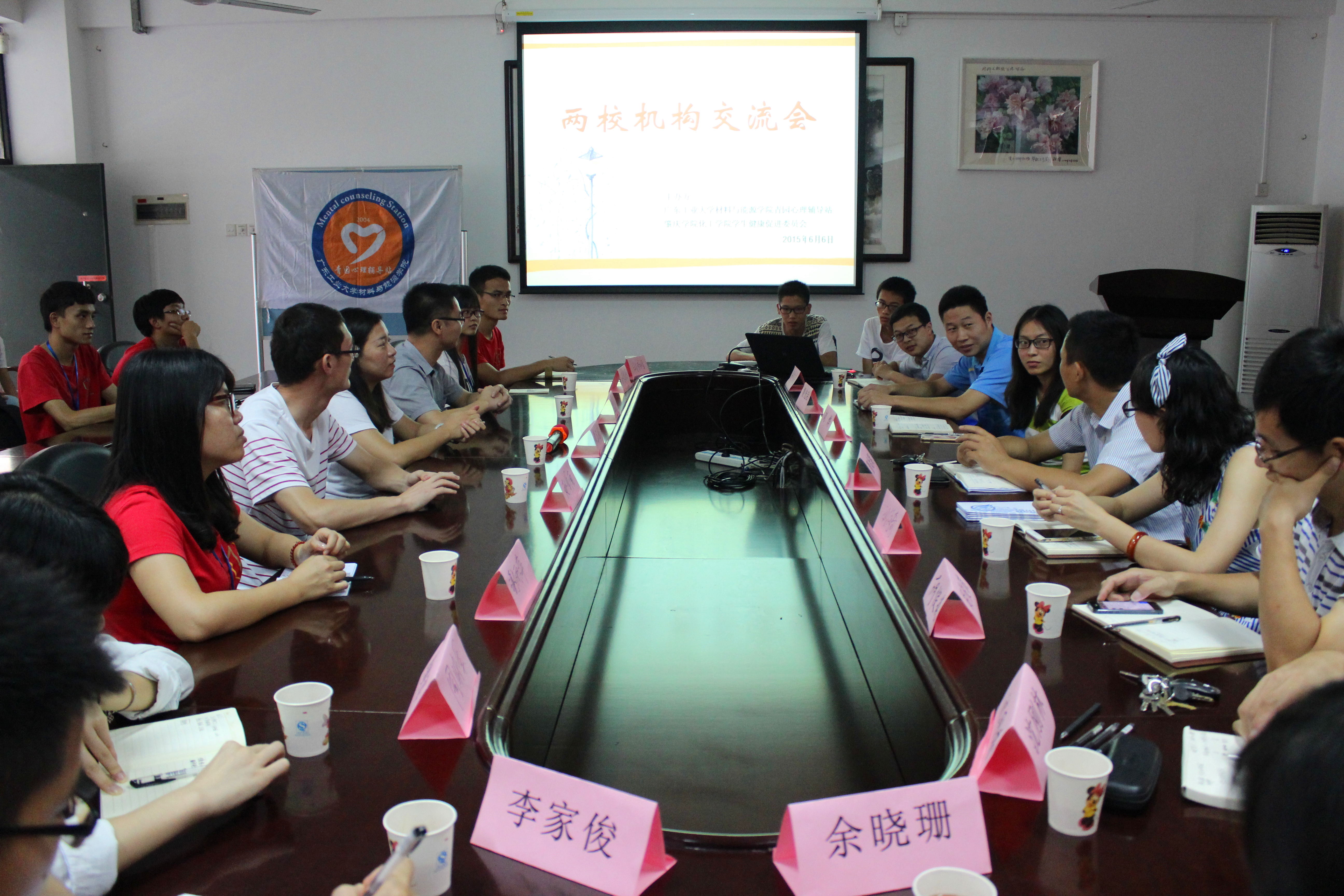 我院师生受到广东工业大学材料与能源学院师生的热情接待。经过简单的人员介绍后,双方以PPT、视频等形式介绍了彼此的学校、学院及各机构的概况,并针对心理健康教育各个特色活动开展了重点展开介绍。随后则通过“对口”的形式进行分组讨论交流,部分组别还在广工学生的带领下参观了广东工业大学校园。