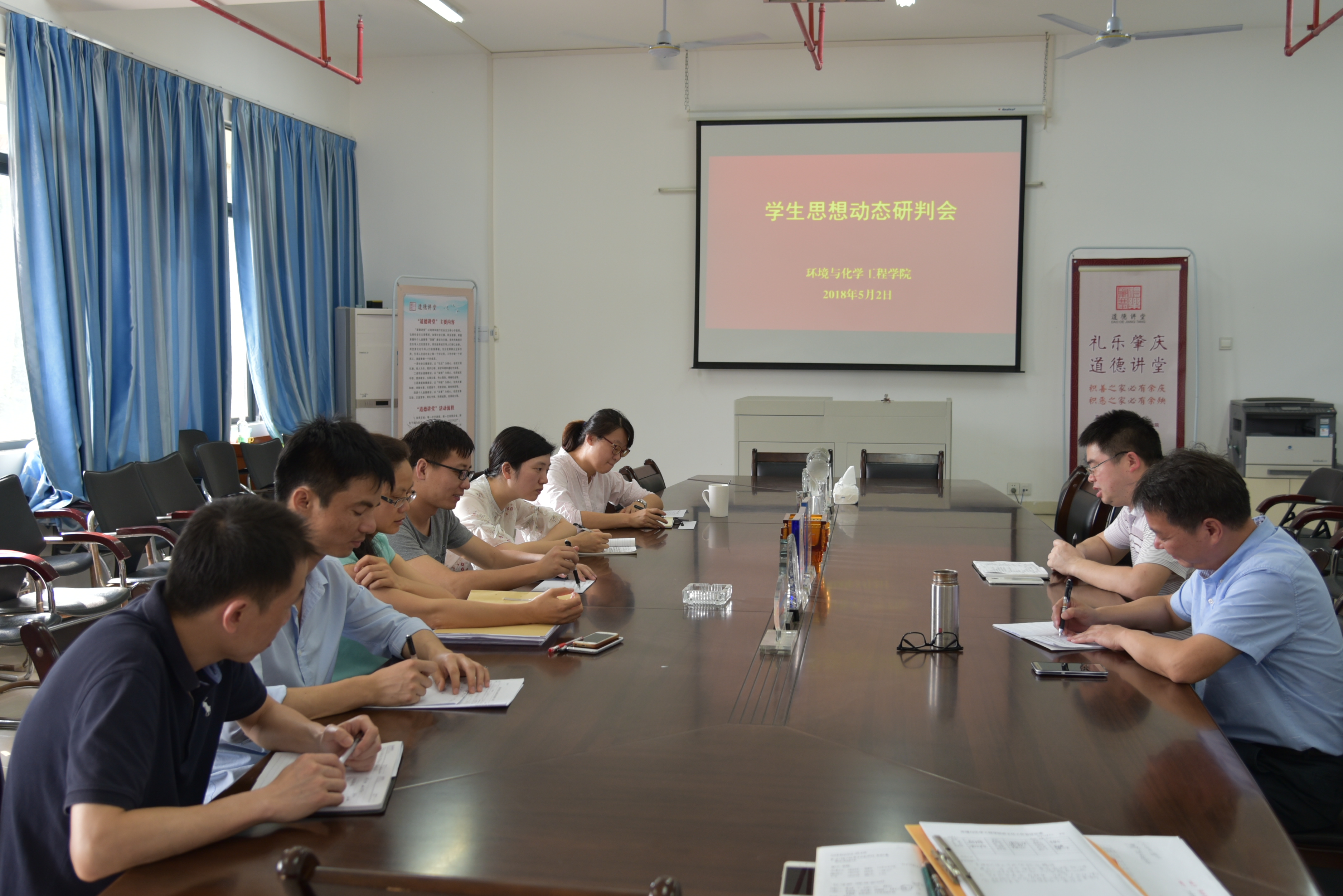 2018年5月2日下午,环境与化学工程学院春季学期学生思想动态研判会在理工楼218会议室召开,学院党委书记李湘、副书记梁标出席会议,学院全体班主任老师参加会议并作发言。会议由李湘书记主持。