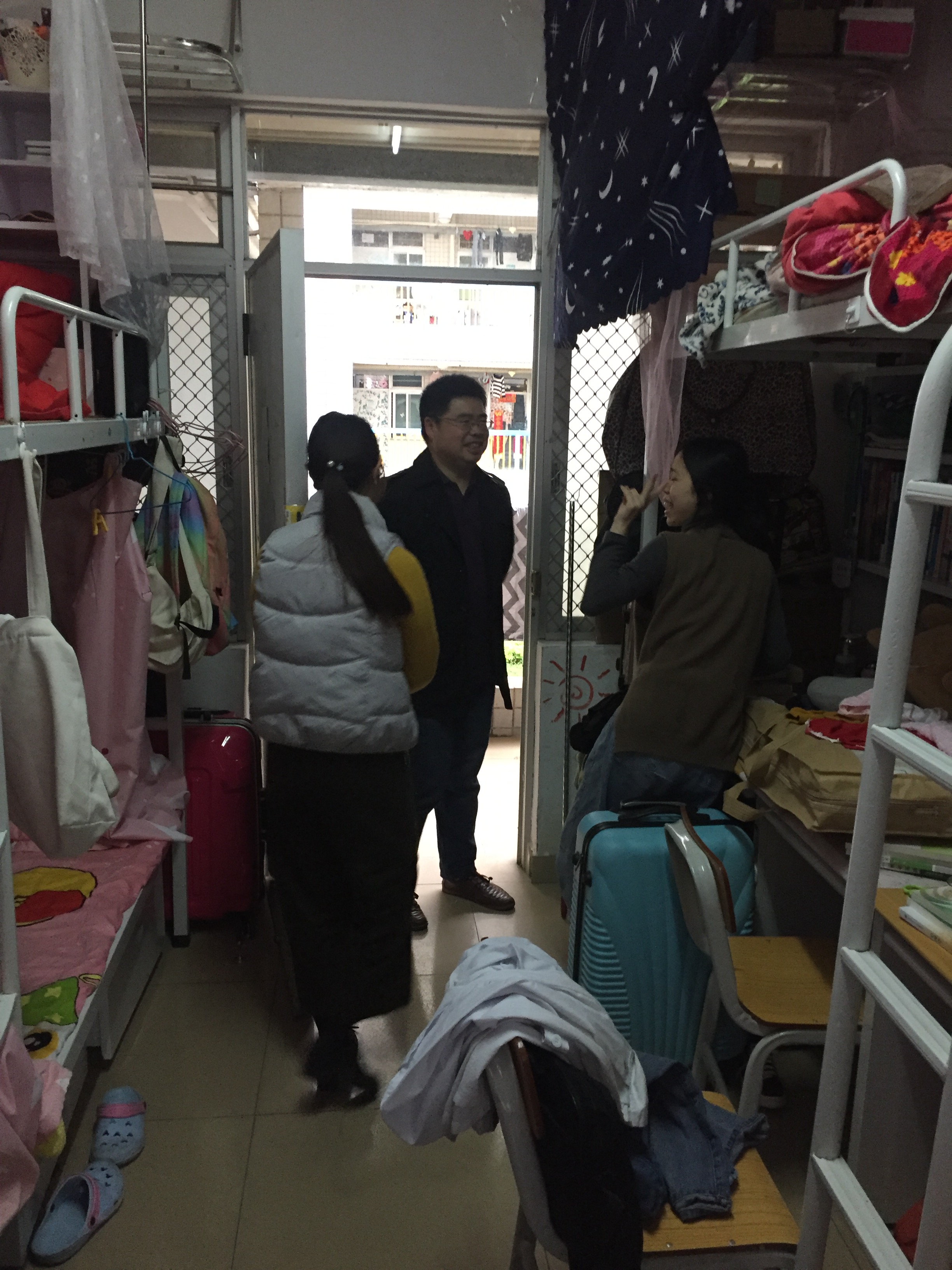 为贯彻落实学校会议精神,了解学生返校情况,确保学校安全稳定,2月24日下午,党委书记李湘带队对学院宿舍进行了一次走访。