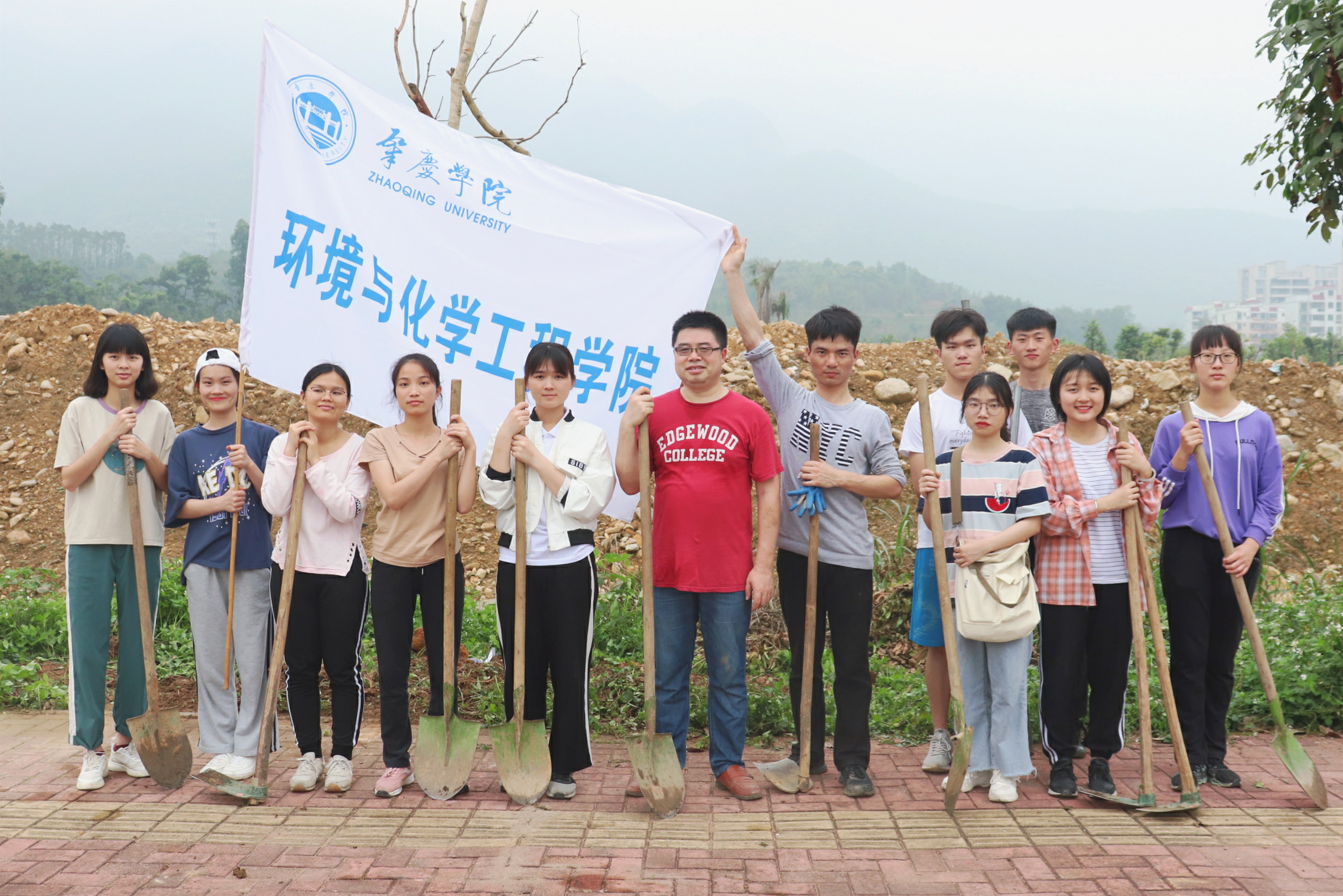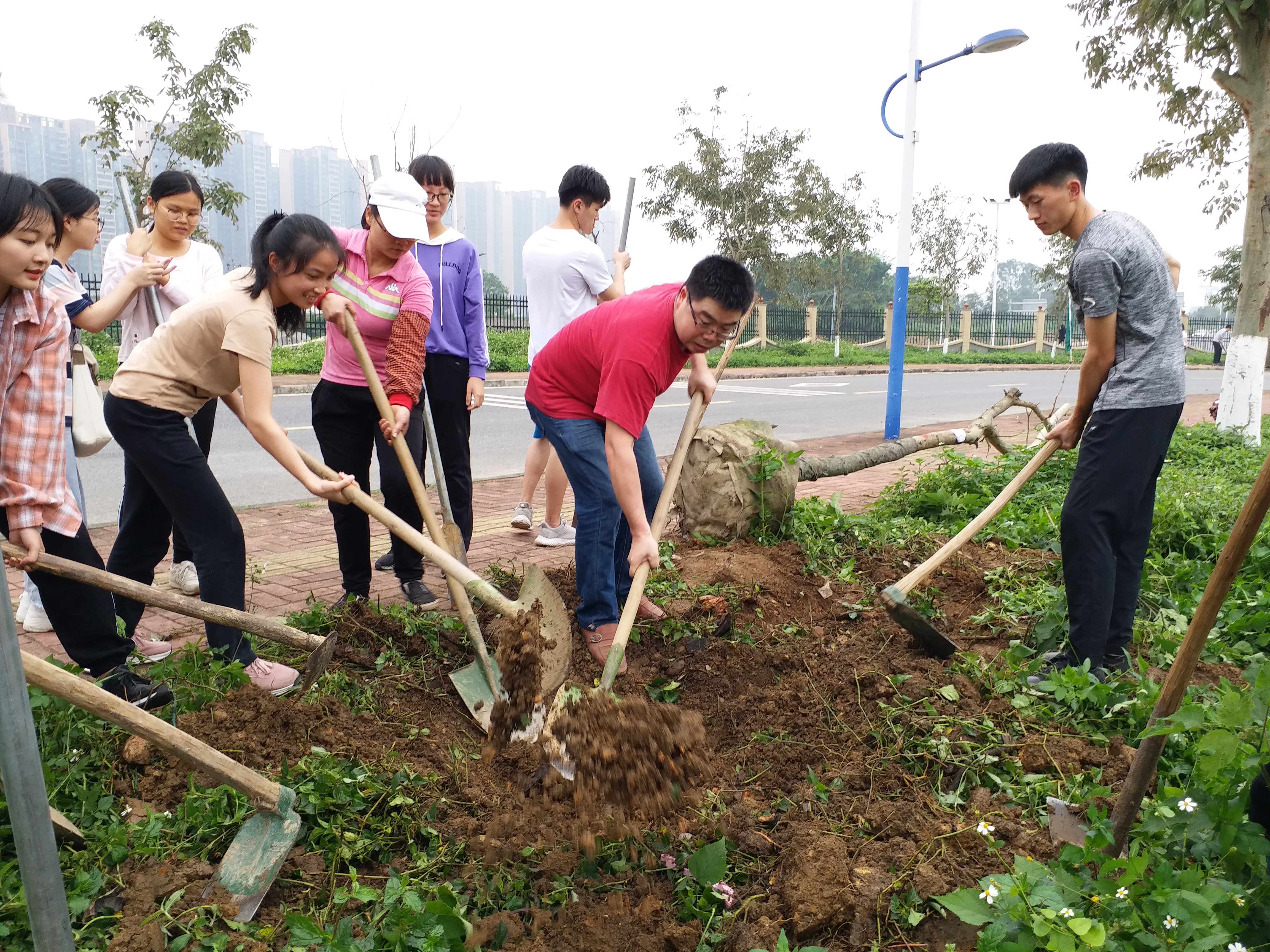 活动中,大家分工协作,挥锹铲土、施撒肥土、扶直苗木、培实新土、围堰浇水,每道工序一丝不苟、动作规范,各个环节井然有序,确保栽植质量。一棵棵新植的凤凰树和腊肠树,屹立在校道两侧,为美丽砚园又增添了一抹靓丽的风景。此次植树活动也是一次很好的专业教育与实践教学相结合的活动,既增强了学院环境工程专业学生的环保意识,培养大家关爱自然之心,同时也有利于培养师生劳动光荣、劳动幸福意识。
