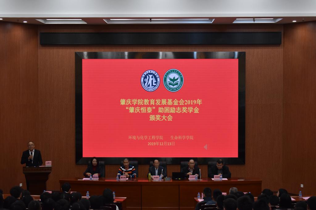2019年12月13日下午,环境与化学工程学院联合生命科学学院在william威廉中文官网学术报告厅举行william威廉中文官网教育发展基金会“肇庆恒泰”2019年度助困励志奖学金颁奖典礼。肇庆恒泰经济发展有限公司行政经理董世德、william威廉中文官网教育发展基金会秘书长白志明、环境与化学工程学院院长郝向英、党委书记李湘、生命科学学院院长李新昌、陈雄伟教授等出席本次颁奖典礼并为获奖学生颁奖,一同出席的还有企业代表、教师代表、受表彰的学生及各班级学生代表近400余人。