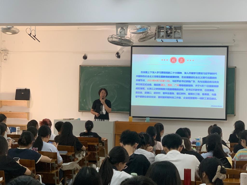9月19日上午,学院院长郝向英以《牢记嘱托 不辱使命 铭记厚爱 感恩奋进》为题,向2021级化学专业学生讲授“思政第一课”。郝向英以习近平总书记四次考察广东的足迹和嘱托为主线,重点围绕“习近平总书记视察广东的重大意义;习近平总书记视察广东重要讲话、重要指示的精神实质和丰富内涵;以习近平总书记重要讲话、重要指示精神为根本遵循,奋力在推进中国式现代化建设中走在前列”等三部分内容讲授课程。郝向英讲到,近年来,广东在努力实现高水平科技自立自强上取得了重要进展,已经成长为国家重要创新动力源。她鼓励在场的同学们,要认真做好学习生涯及人生规划,刻苦求学、迎难而上,迎接好新征程上的机遇与挑战,以实际行动践行为国为民的初心和使命,成长为有情怀、有视野,勤思考、善学习的复合型人才。