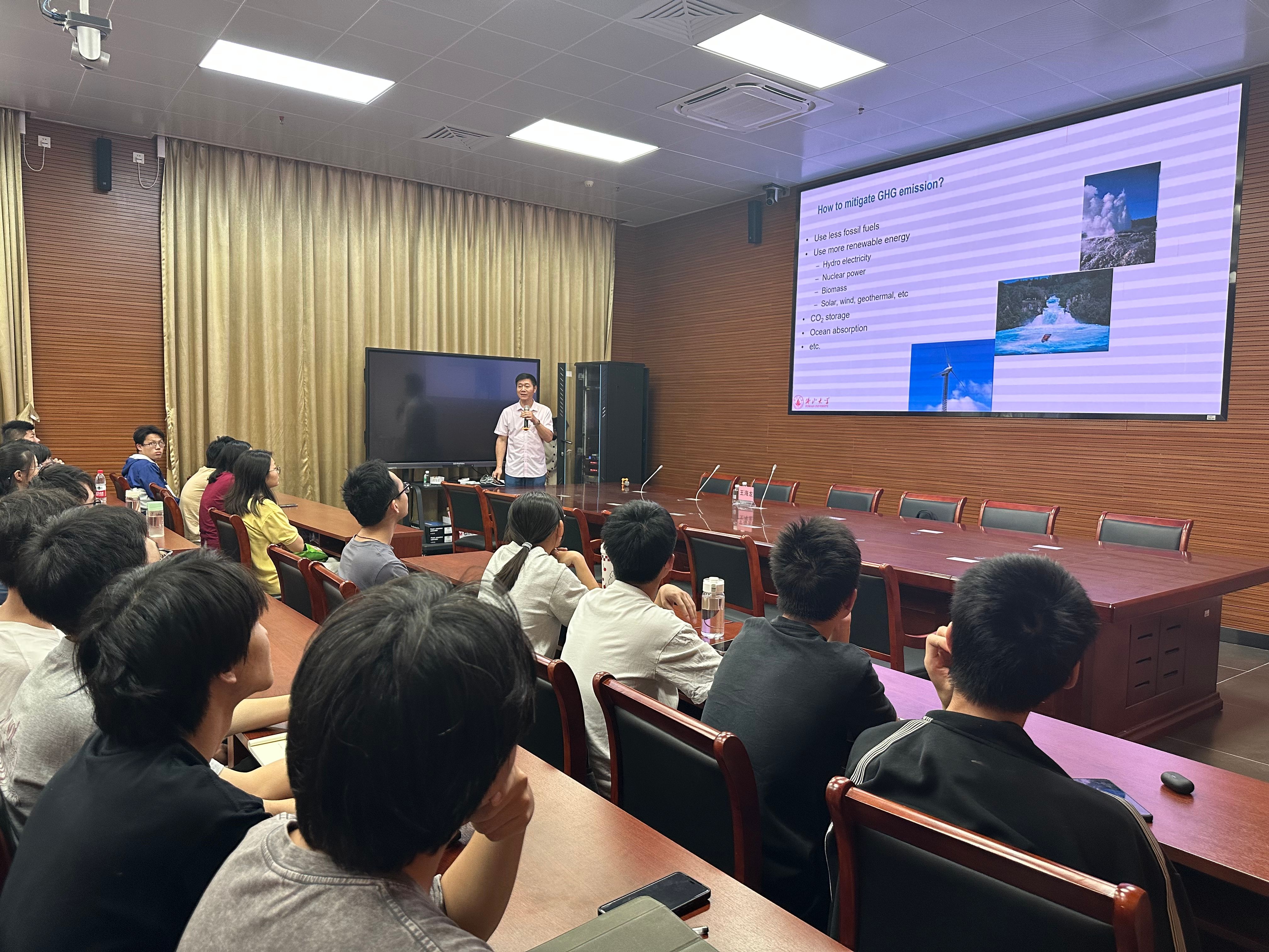 本次报告主题为《生物炭及其改性在环境修复中的应用》,由学院副院长吴贤格主持,环境工程系骨干教师、辅导员及学生共同聆听。王教授首先重点阐述了生物炭与碳中和、土壤肥力和修复的相关研究,以及其生产设施研发情况。他深入剖析了生物炭及其相关研究的远大前景和重要意义,为广大师生呈现了一场别开生面的学术盛宴。师生们全神贯注,沉浸在王教授精彩的讲解中,对生物炭科技领域的热情与兴趣被充分激发。报告接近尾声时,王教授与广大师生开展了互动答疑,内容涉及生物炭研究及留学深造等方面。师生们积极提问,王教授耐心解答,现场气氛热烈。