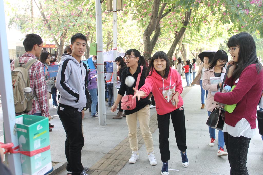 在弥漫着花香的紫荆校道,服务队通过多次摆摊进行了以“奉献爱心,因我精彩”为主题的明信片制作大赛,并选出优秀作品,以此挖掘大学生的爱心,展现志愿者的风貌,为周年庆典添彩。在服务队摆摊处,还有志愿者们三年来的活动照做成的照片墙,一张张照片,一个个笑脸,都展示着服务队永不磨灭的宗旨;同时,服务队还在三饭二楼荷塘月色播放了志愿者的活动视频,以及老师、志愿者、“心连心”慈善机构义工等的生日祝福,一句句简单的祝福饱含着大家对志愿服务的肯定及赞扬。除此之外,服务队还通过微博转发抽奖和微信祝福庆祝生日,不仅注入了时尚元素,也达到了宣传与推广的效果。18日中午和下午,在紫荆校道,志愿者们身着服务队队服,和同学们聚集在一起玩游戏,送出由服务队制作的卡贴,以此将服务队的理念传承,将志愿者的精神发扬。在本次庆典活动中,服务队还将选出优秀“紫荆”队员进行表彰奖励。