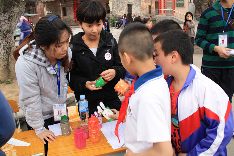 中午时分志愿活动正式开始,沙湖小学师生跟随着我院志愿者的脚步走进了元咀村。我院志愿者通过调查问卷,环保知识小问答,画报展示等形式向村民倡导环保,使村民们认识到了垃圾分类放置,废旧电池回收等绿色生活的重要性。在本次志愿活动过程中还向小学生们展示了自己用废纸废瓶做的工艺品,告诉他们要学会废物利用。同时,志愿者们也走进村民家中,帮助村民做力所能及的事。他们挥洒着汗水,年轻的脸庞上洋溢着青春的笑容,引得过往行人纷纷驻足称赞。