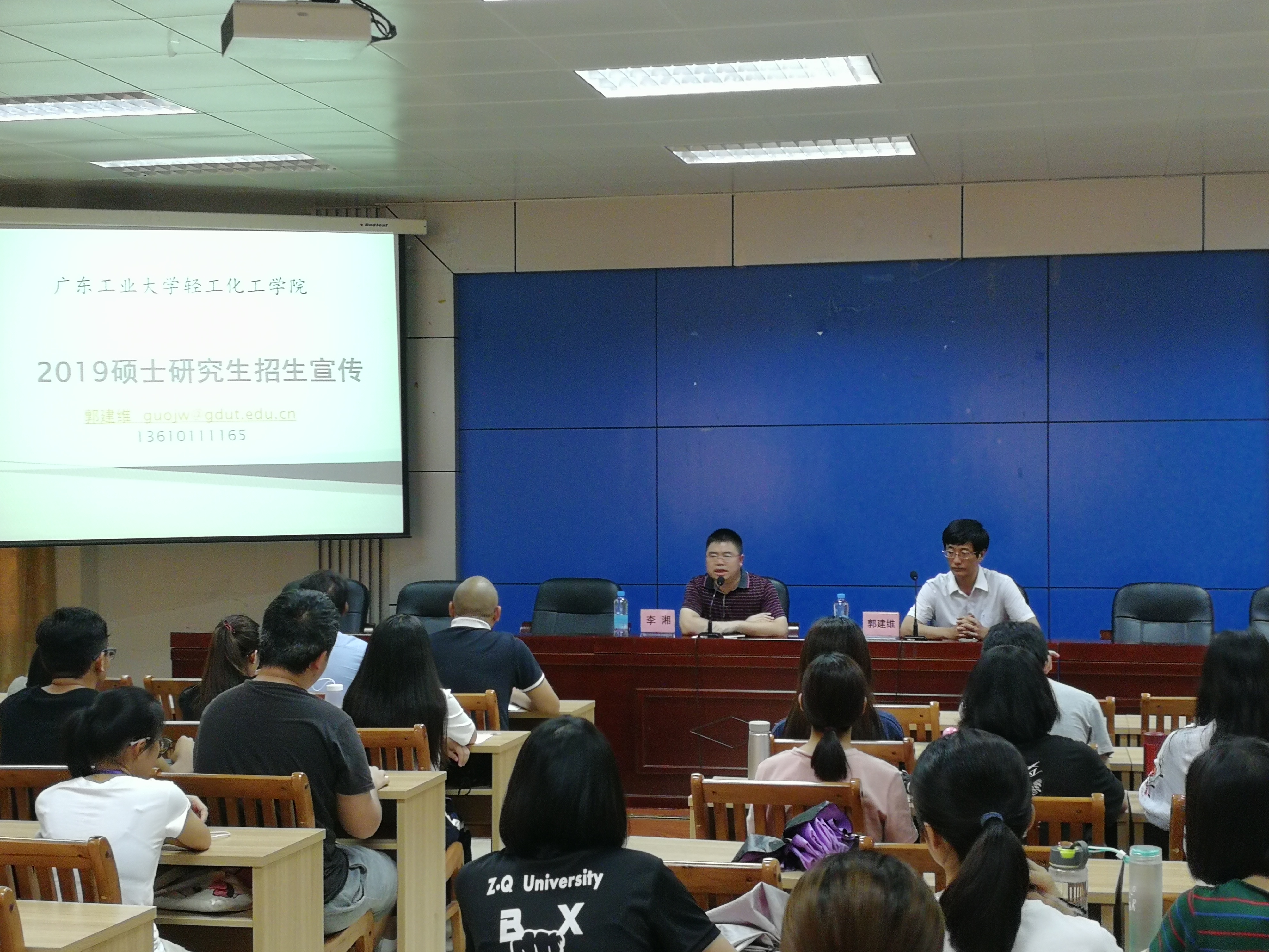 (本网讯)2018年5月23日下午,学院在校行政楼就业招聘大厅召开“广东工业大学2019研究生招生宣讲会”。此次宣讲会由教授、博士生导师、广东工业大学轻工化工学院副院长郭建维主讲,出席人员有:广东工业大学研究生招生负责人马巍老师,环境与化学工程学院党委书记李湘、党委副书记梁标、副院长吴贤格和80名有意愿考研学生。