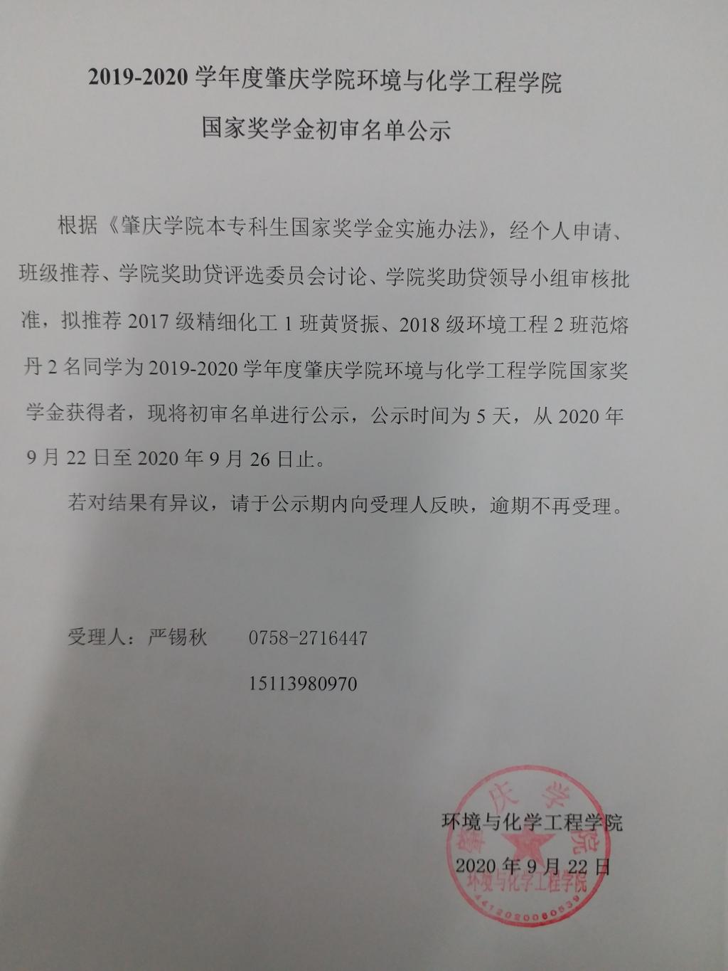 根据《william威廉中文官网本专科生国家奖学金实施办法》,经个人申请、班级推荐、学院奖助贷评选委员会讨论、学院奖助贷领导小组审核批准,拟推荐2017级精细化工1班黄贤振、2018级环境工程2班范熔丹2名同学为2019-2020学年度william威廉中文官网环境与化学工程学院国家奖学金获得者,现将初审名单进行公示,公示时间为5天,从2020年9月22日至2020年9月26日止。