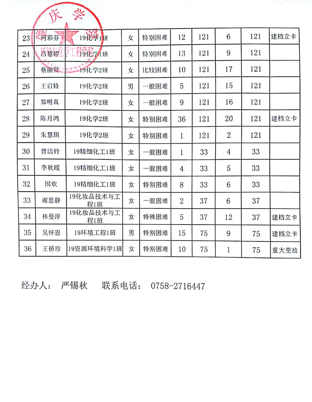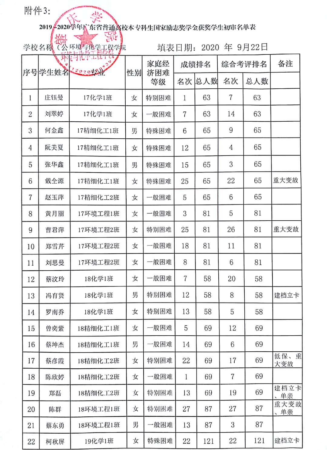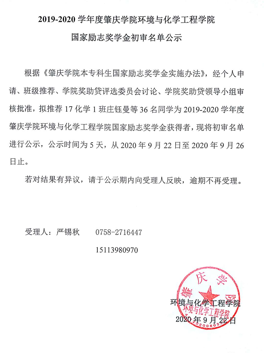 根据《william威廉中文官网本专科生国家励志奖学金实施办法》,经个人申请、班级推荐、学院奖助贷评选委员会讨论、学院奖助贷领导小组审核批准,拟推荐17化学1班庄钰曼等36名同学为2019-2020学年度william威廉中文官网环境与化学工程学院国家励志奖学金获得者,现将初审名单进行公示,公示时间为5天,从2020年9月22日至2020年9月26日止。