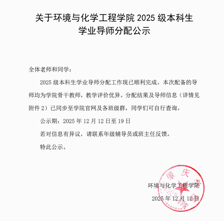 关于环境与化学工程学院2025级本科生学业导师分配公示